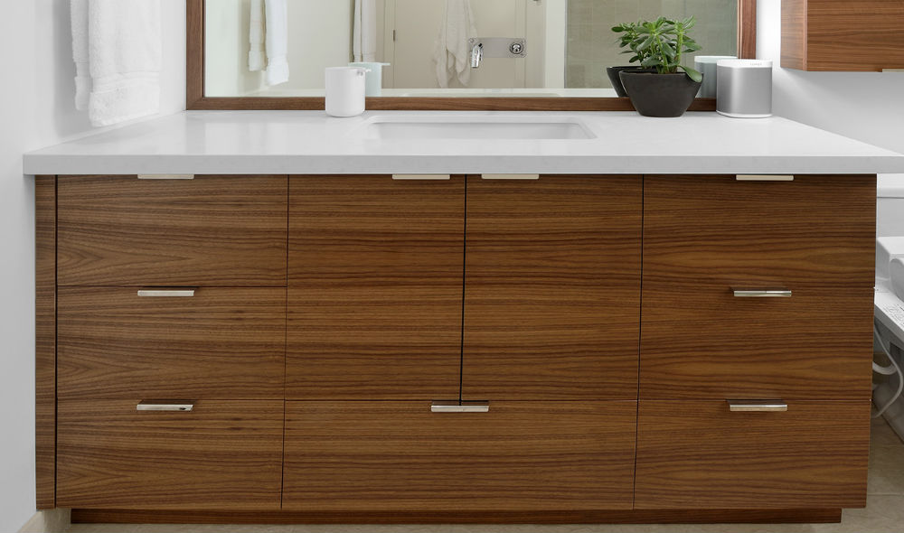 This bathroom renovation within Toronto’s Thompson Hotel included a new contemporary vanity in the master bathroom with this stunning wall mounted faucet coming thru the wall mirror