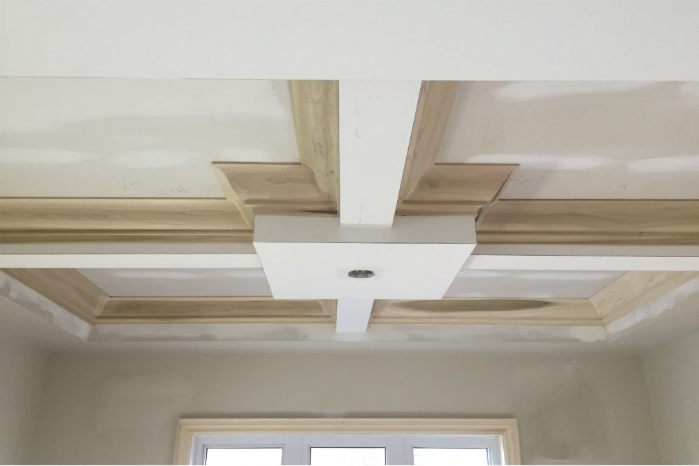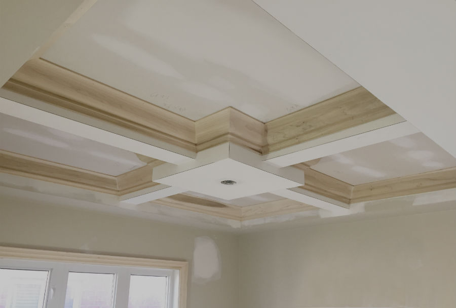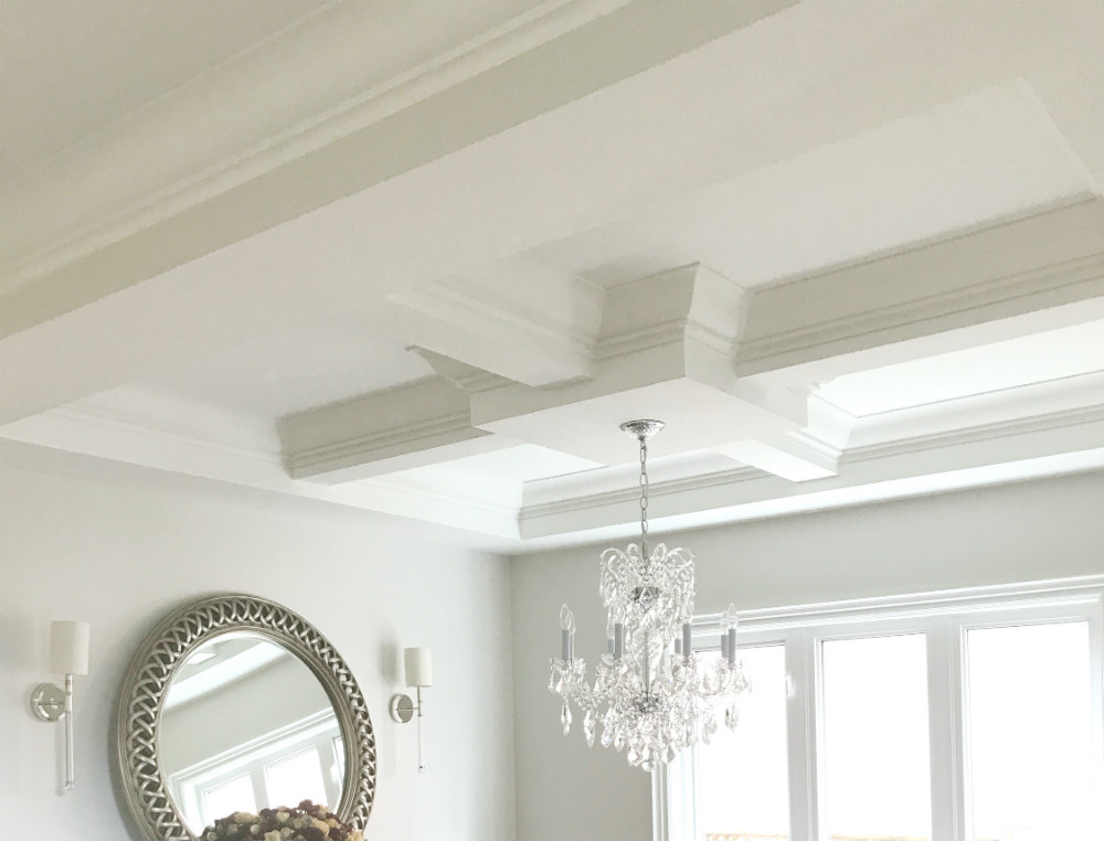 This dining room ceiling renovation in Oakville included a full teardown of the existing ceiling and custom installation of a waffle ceiling