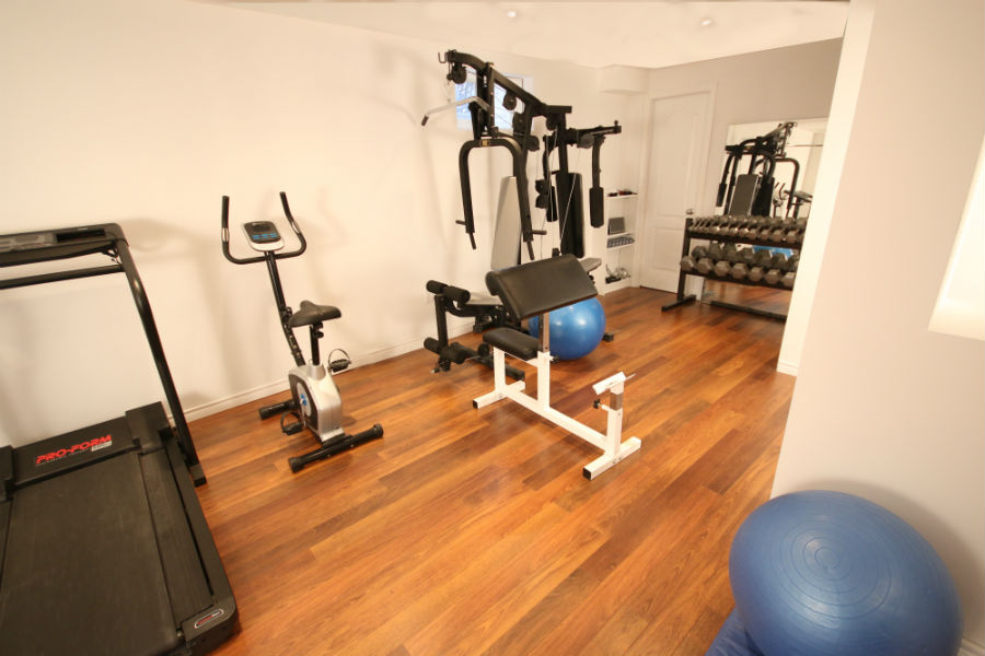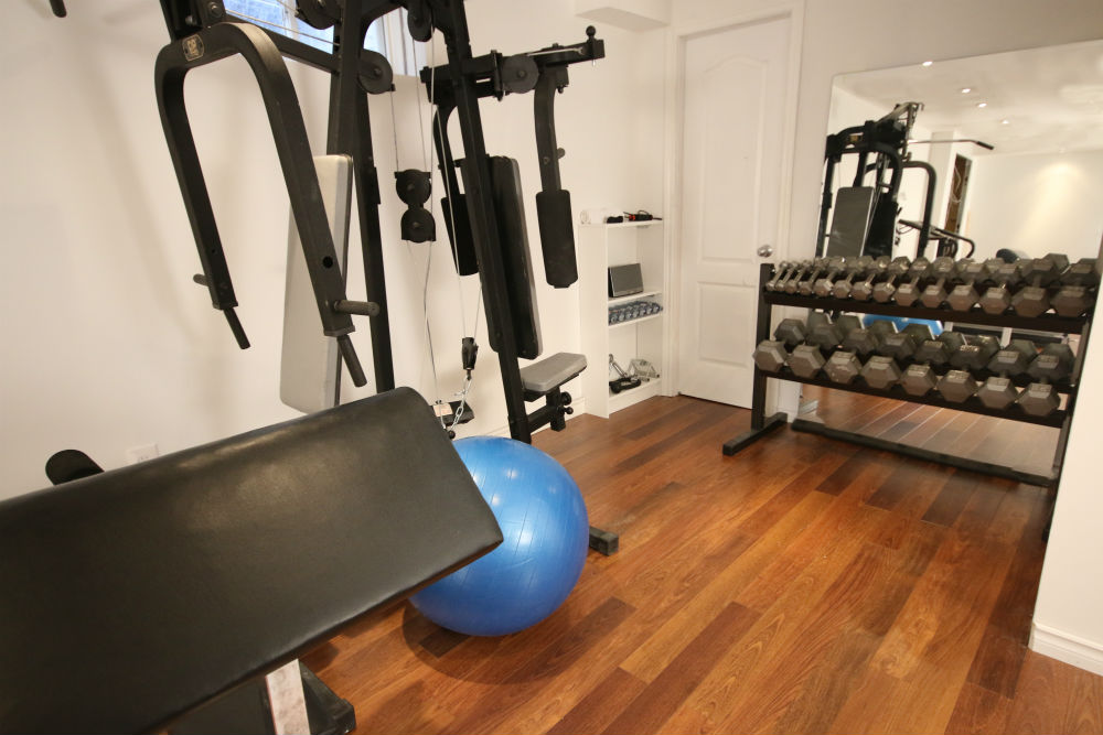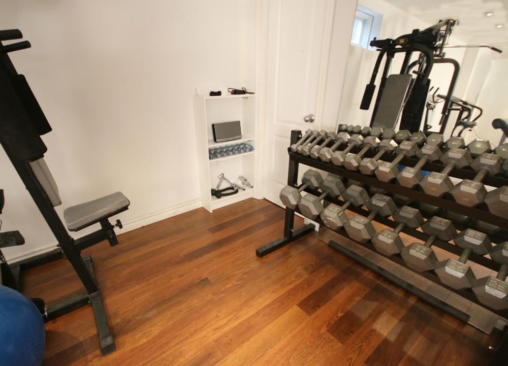 This basement renovation in Oakville included a full basement build with brand new flooring and Safe’n’Sound underpaid from Torlys for the exercise equipment. We built out some custom shelving to store fitness attachments
